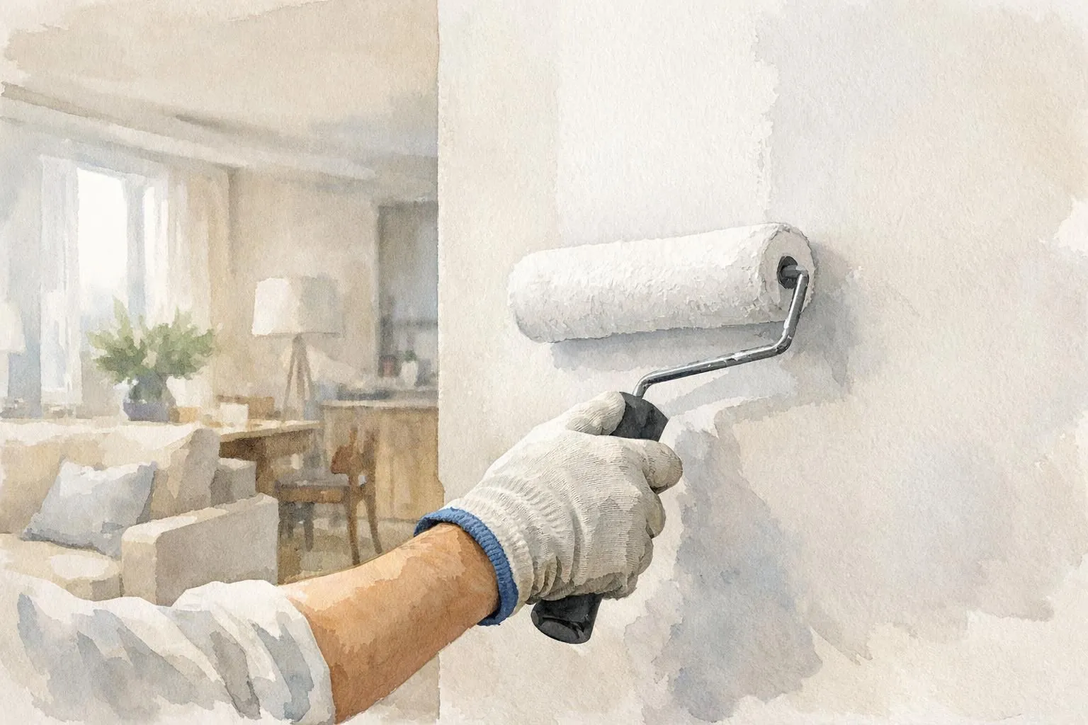 Réparation des impacts, lessivage des surfaces, application de deux couches sur murs et plafonds. Le samedi matin, l'appartement sent encore la peinture fraîche.